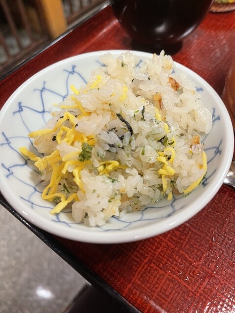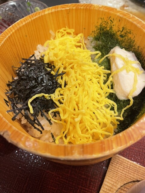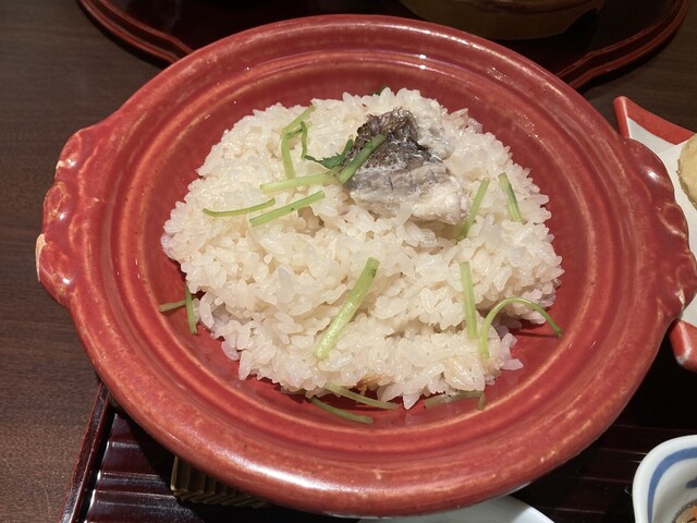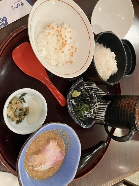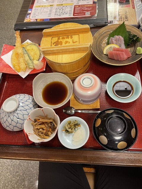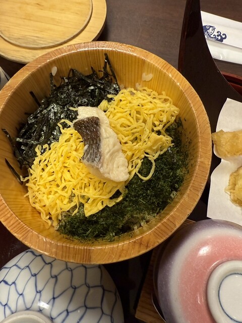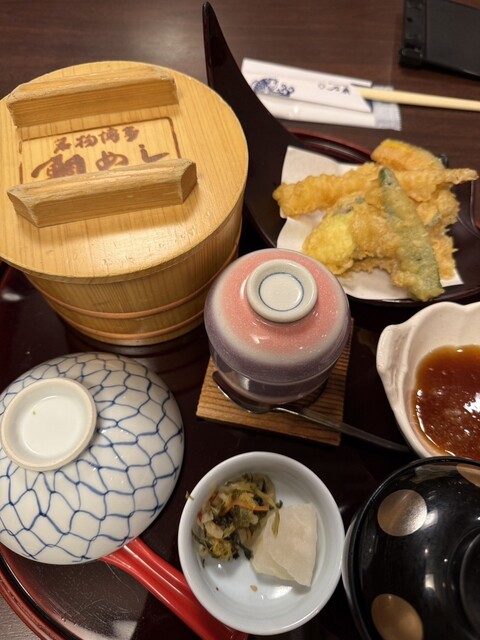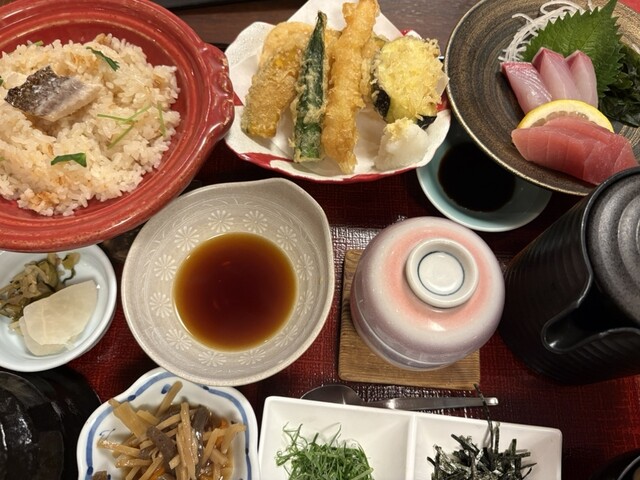 鯛めし、刺身、天ぷら、茶碗蒸し、小鉢、赤だし、香物の膳で名物の鯛めしは出汁で炊き上げたご飯の上に載っているタイがホ...
