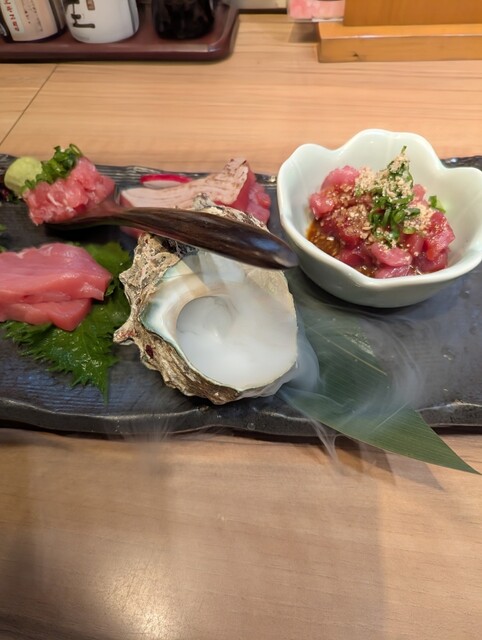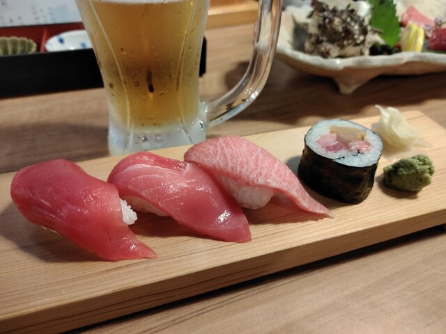 博多駅のバスタの道の反対側のビルの地下1階にあります。入口が少し分かりづらいです。私は、福岡空港から直行して福岡の友人と当店のカウンターで待ち合わせました。マグロの寿司盛り&お寿司とアサリの味噌汁の@...