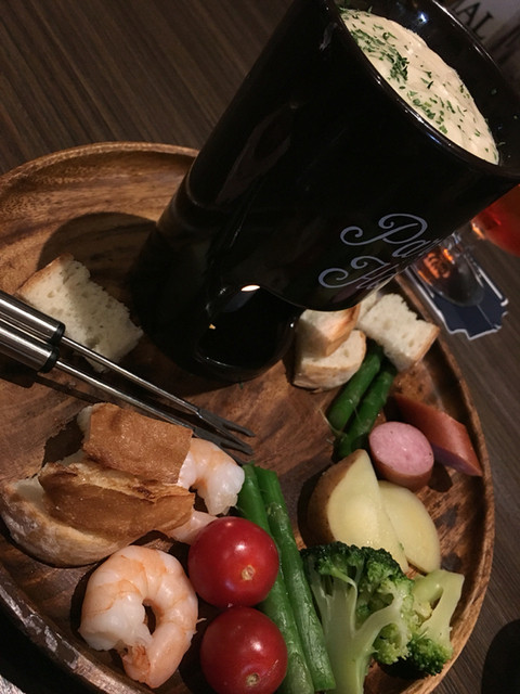 次にチーズフォンデュ!野菜やパンが盛りつけてあり、すごく美味しかった。