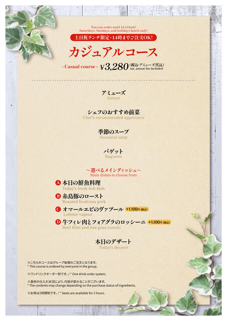 予約可 •お席は二時間制でのご案内をさせていただいております。 |