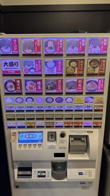 2025年12月平日21:00往訪。博多駅から歩ける好立地な直系ラーメン。東京なら行列ですが、並びなし。ただ、断続的に来店があり、満席に近い状態。券売機で以下を購入しました。