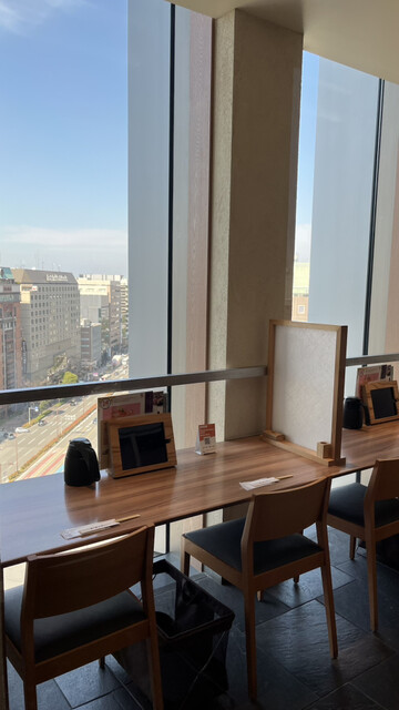 窓際の席では博多の街が見渡せるので開放感抜群!テーブル席やカウンター席もある