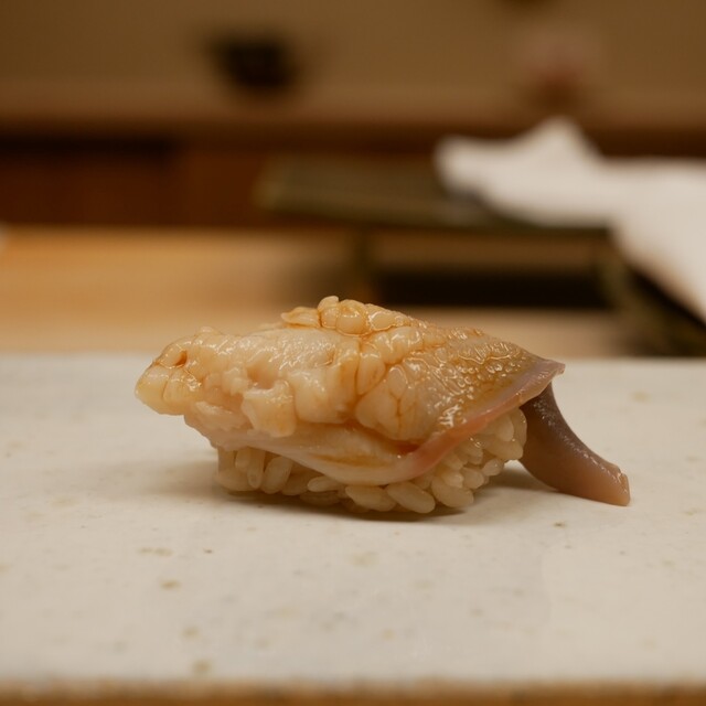 白子のお浸しは、丁寧に血管が取り除かれていて、見た目は真っ白、口触りが滑らかでした。優しいお出汁と見事に調和していました。