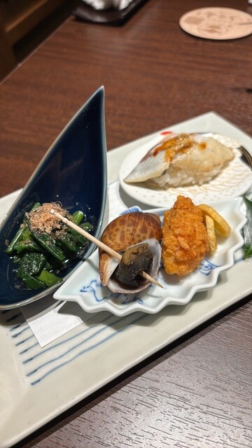 ほうれん草のお浸し・鰻の握り・梅貝の旨煮・タコの素揚げ・銀杏