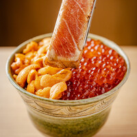 名物の三色丼と当店のおまかせコースを味わえる一番人気のコースです。 ウニいくら丼の上に厚切りの大トロを豪快にのせていきます。