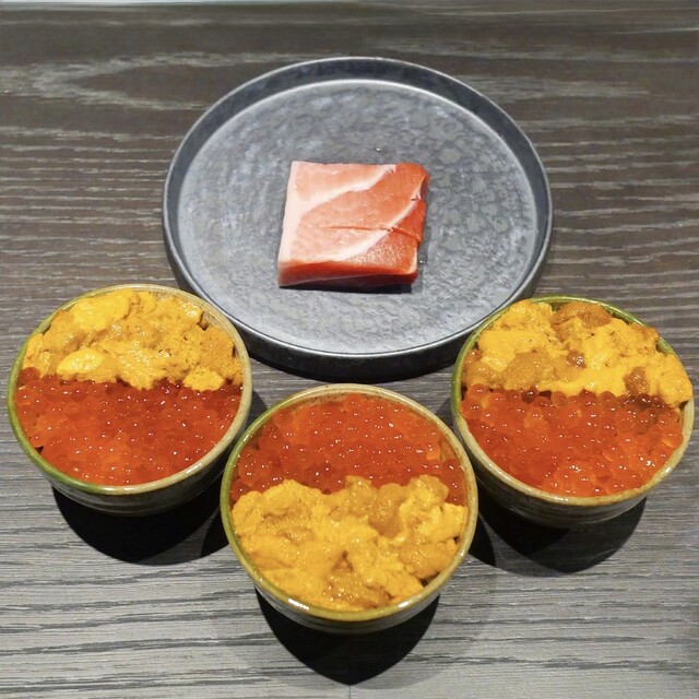 名物の三色丼と当店のおまかせコースを味わえる一番人気のコースです。 ウニいくら丼の上に厚切りの大トロを豪快にのせていきます。 赤酢の酢飯はお替り自由。 ランチタイムに焼うおをしっかり楽しむならこちらのコースがおすすめです。