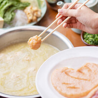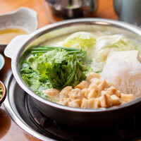 骨つきの鶏肉は柔らかく、そこから取れる鶏出汁のスープは鶏の出汁が凝縮されています。白濁したスープは、コクがあるのにあっさり。酢醤油や紅葉おろしで食べると、また違った風味で愉しめます。ネギに春菊、キャベツとたっぷりの野菜が入った水たきです。 ミンチコースとのミックスも可能です。