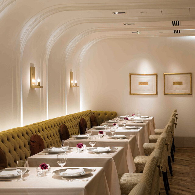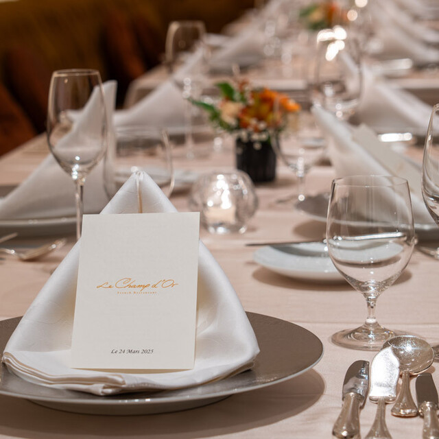 『Le Champ d'Or』~豊かな土壌を連想させる店内のゴールドを基調としたインテリアから、金色の(d’Or)畑(Champ)と名付けました。その名のように、九州の豊穣な土地で育った素材を中心にホテルオークラ伝統の味を守りながら、新たな発想で創るモダンフレンチを提供します。