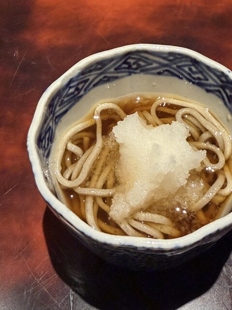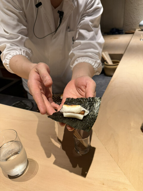 カラスミ餅。カラスミも餅も炭火焼きで、海苔巻き。香りが素晴らしい。