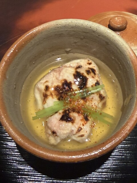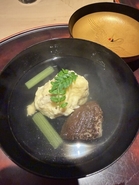 河豚の白子をさっと揚げ、湯葉、ふきのとうの出汁。白子の揚げはふわっとして美味しい。