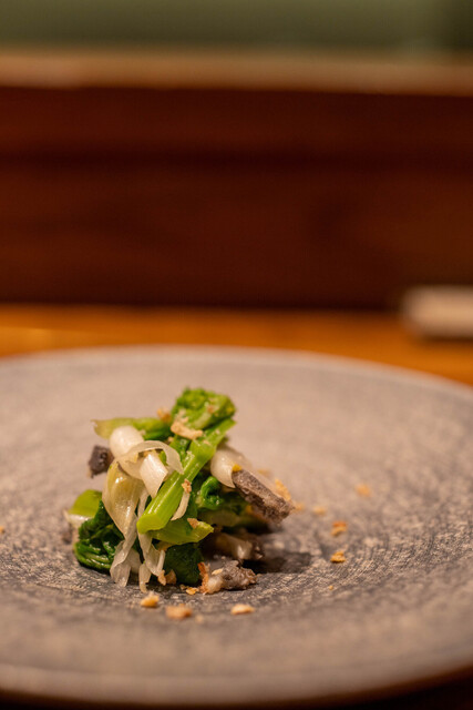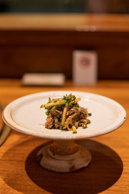 上質な韓国料理を基盤に、九州産の和牛と但馬牛血統の万葉牛を使い分けながら料理を組み立てていく。ある日のコースはスープに始まり、前菜から多彩に仕立てた肉料理へ。魚や野菜も織り交ぜながら全体をバランスよく整え、最後まで食べ疲れさせない。店主・田村氏は、ゲストとのやり取りの中で一皿ごとの着地点を見極め、その時々に最もふさわしい形で料理を提供。その即興性と細やかな心遣いこそが「田無羅」の魅力となっている。