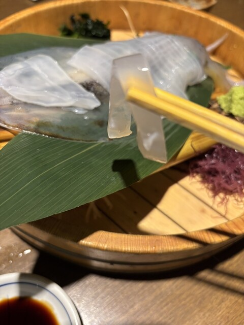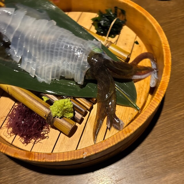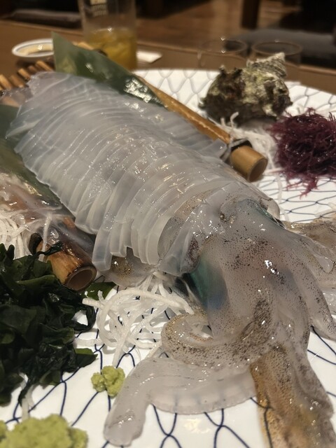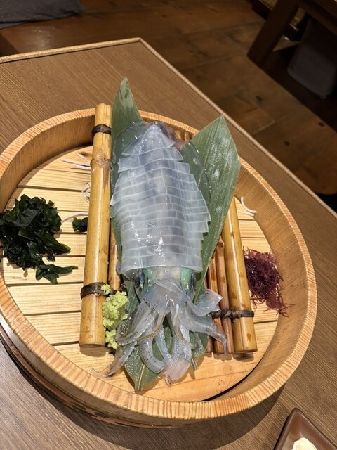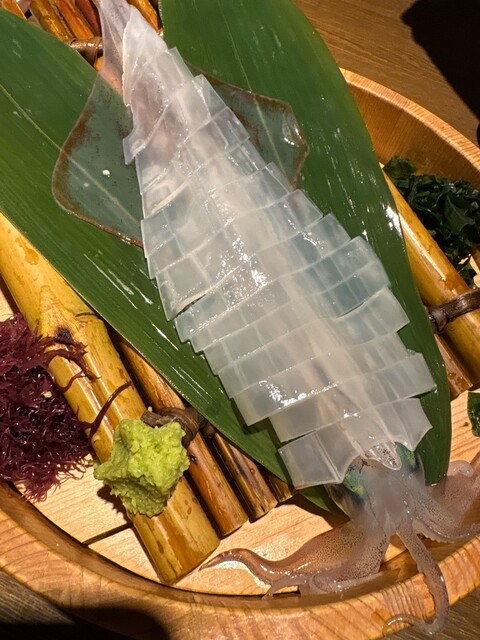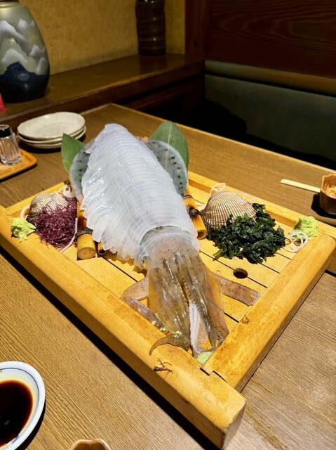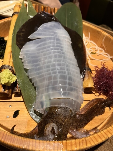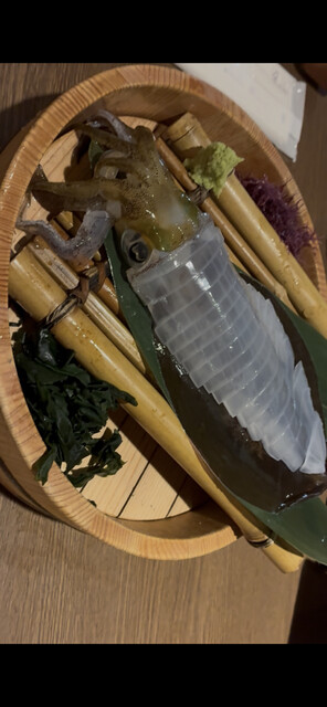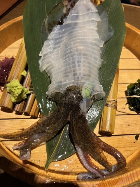 実は前回来た際にはイカが入っておらず、悔しい思いをしたので、今回は予約の段階でイカ刺しをお願いしておきました。