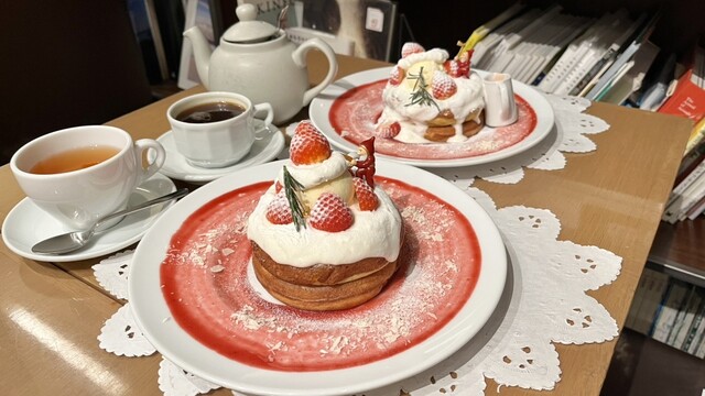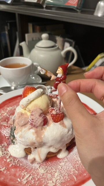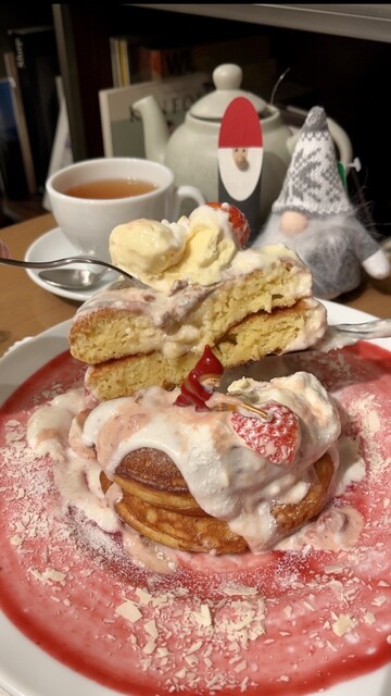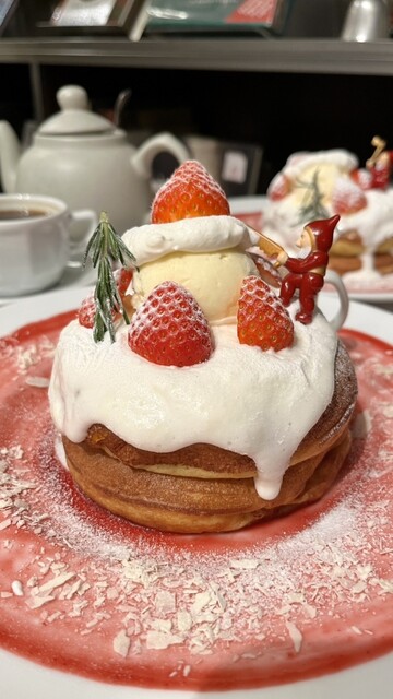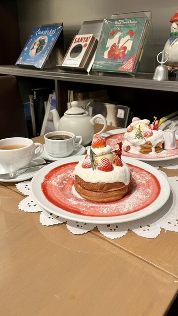 11時少し過ぎに行きましたら1人で、 でもその後次々にお客さんが来店してきました。 席には、隣に、飛沫防止のパーテーションが立てられていて良いですね。 フードメニューも沢山ありましたが、 今日は、デザートを。 クリスマススイーツを。 生ミルキークリームのパンケーキ いちごバターソース1700円を。 単品で。 15分程かかりますが、 と言われましたけど、落ち着ける店内で... 詳細を見る