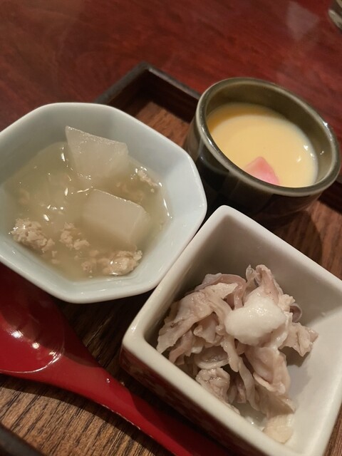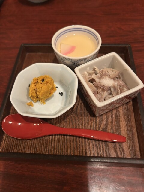 茶碗蒸し、南瓜と胡桃のサラダ、酢もつ