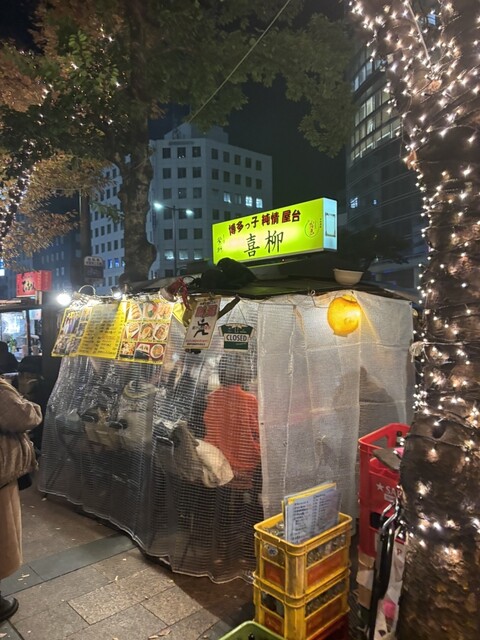 1人でも気軽に入れる屋台、地元のお客様もいるので色んな福岡の話が聞けるよ!大将も地元博多出身の祭好き、気軽に話しかけてね。福岡、博多の思い出に博多っ子純情屋台喜柳でまっとうけん!予約時間通りに入れない場合もあります。その場合はお待たせしてしまいます。お願いします
