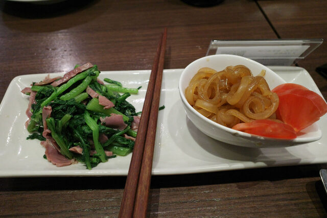 前菜の盛り合わせ 青菜の炒め物とクラゲからスタート