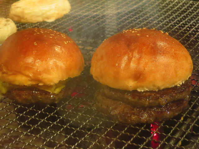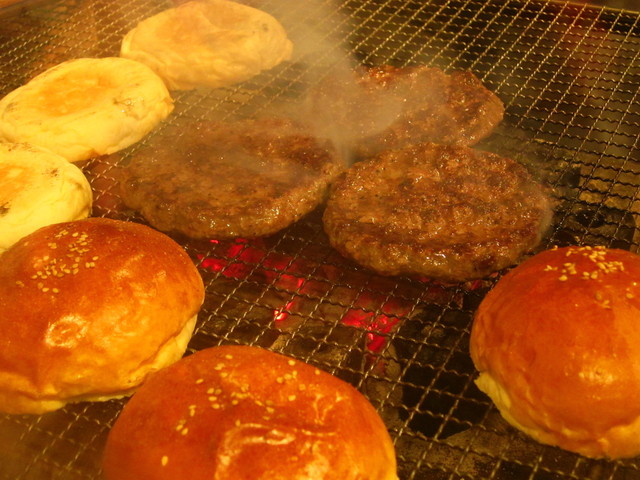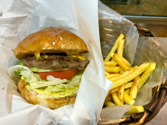 平日11:40に訪問すると他にお客さんはいない。 恐る恐る店内に入ると店内は薄暗く、中央部分に炭火が焚いてある。 店長さんにチーズバーガー@1,200とポテトM@400をオーダ... 詳細を見る
