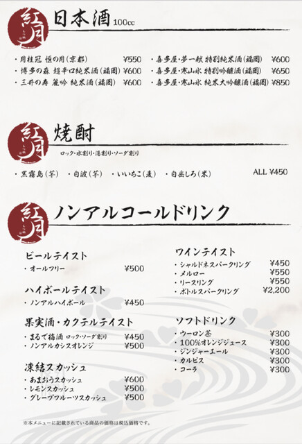 | ドリンク | 日本酒あり、焼酎あり、ワインあり、カクテルあり |