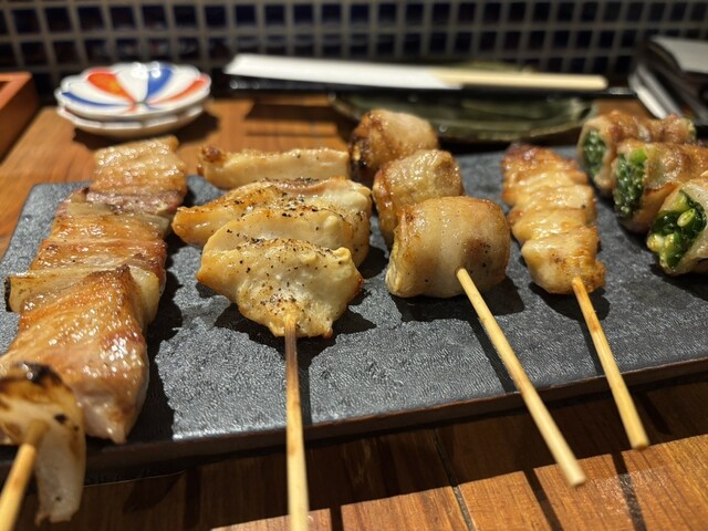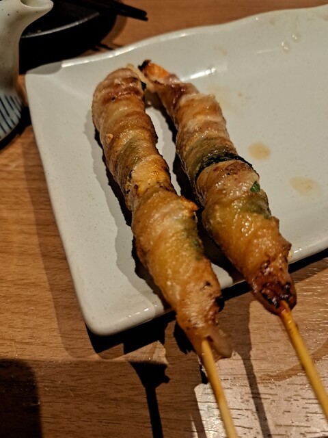出張2日目の晩は、出張仲間が福岡で野菜巻きが流行っていると言い出し、こちらのお店へ伺いました。 お店に入ると、1階はカウンター席で、私達は2階のテーブル席へ案内されました。 席に着くと、先ずは生中を注文し、メニューを確認。 少しして、生中が到着し早速乾杯! 従業員さんに人気のメニューを確認すると、レタス巻きが人気とのことでしたので、レタス巻きと数種類の野菜巻きや串焼きを注文... 詳細を見る