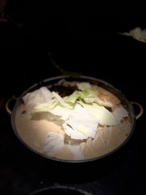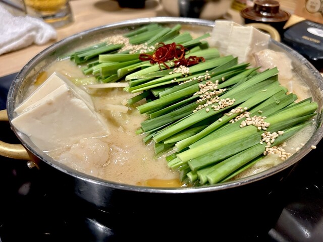 もつ鍋はおすすめの味噌味を注文。スープは濃厚ながらもくどくなく、白味噌のまろやかさににんにくの旨味が溶...