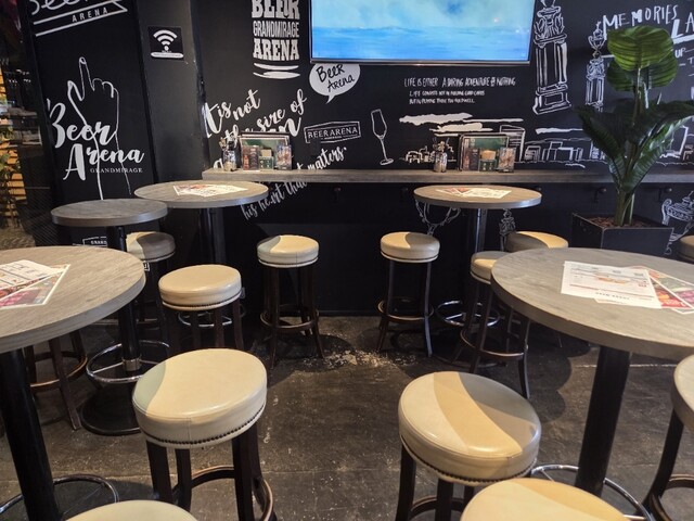 テーブル席とカウンター席がゆったり配置され、壁面には大きなテレ...