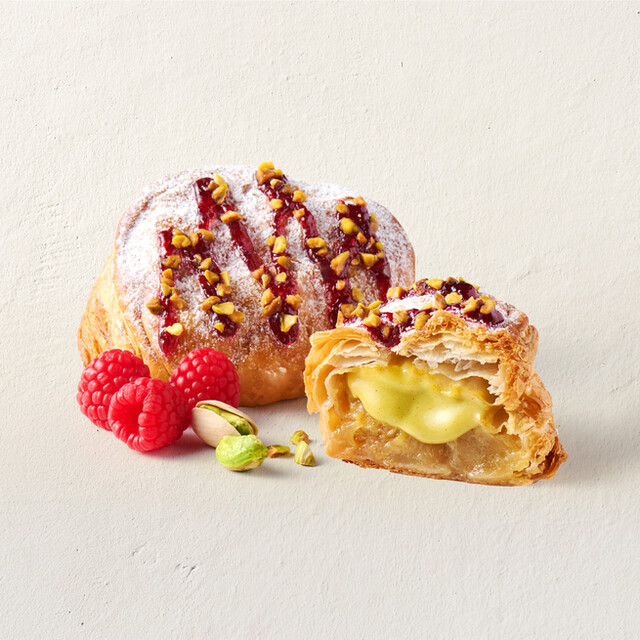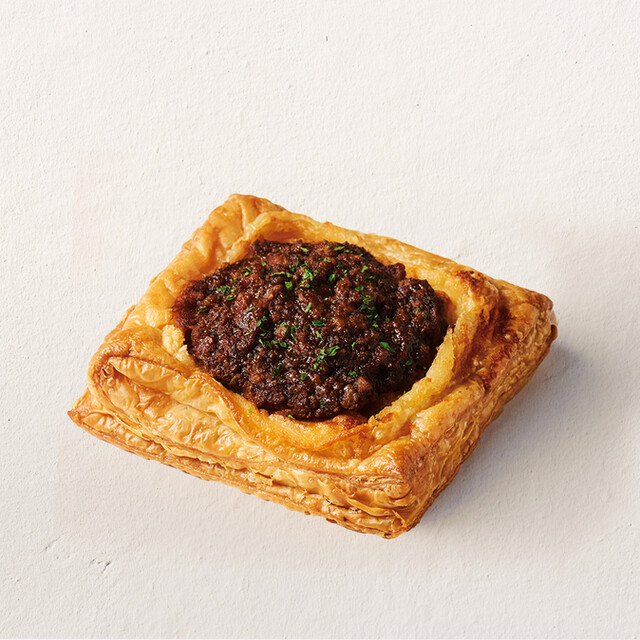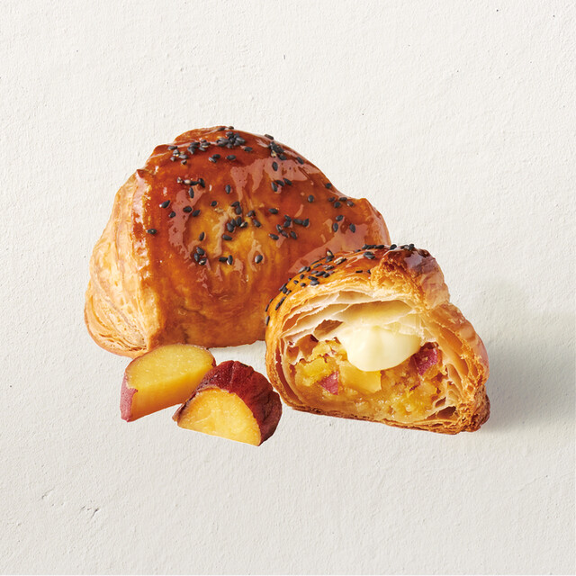 りんごの酸味をやさしく包み込むなめらかで濃厚なカスタードクリームがたっぷり入っているのが特徴。フレッシュバターを丁寧に練り込んだパイ生地のサクサク食感をより楽しんでいただくために、グローブ型に仕上げへ。