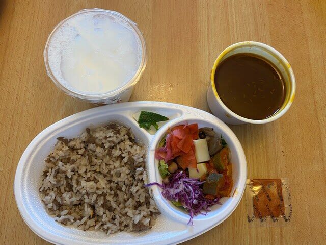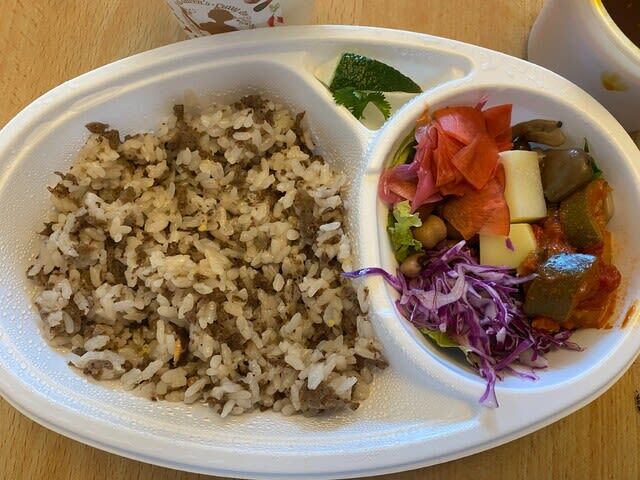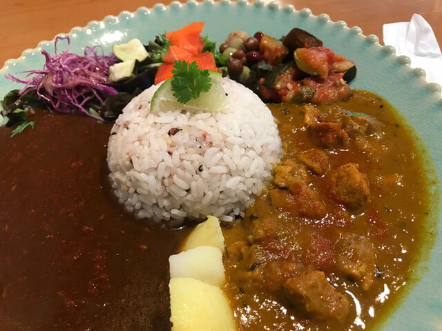 店内は可愛い雰囲気で、合いがけするカレーのルーによって値段は変動します。ご飯は量選べますが値段は同じ。