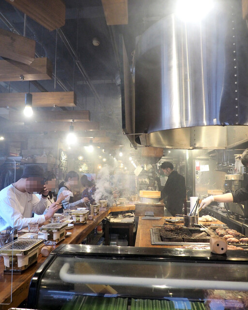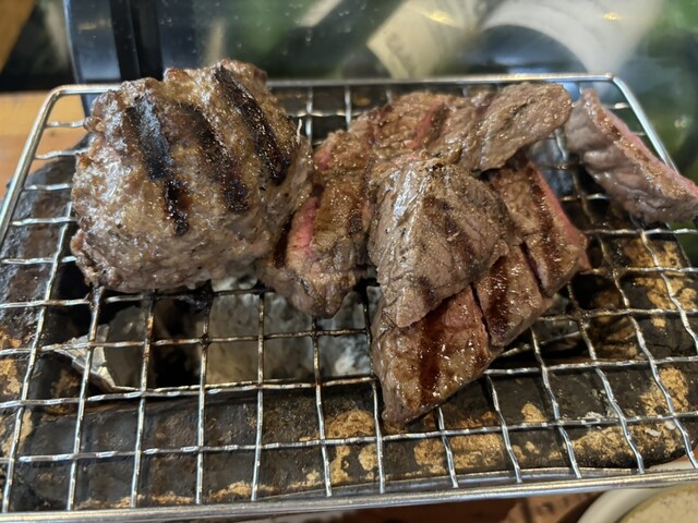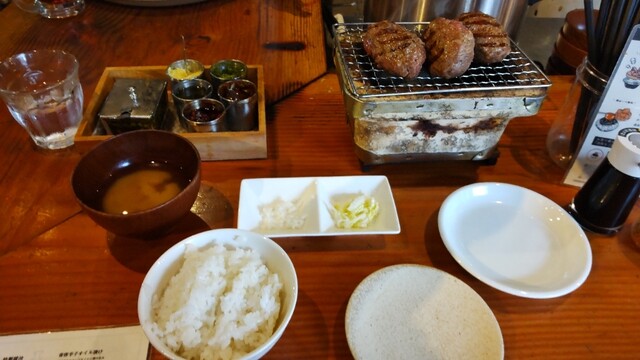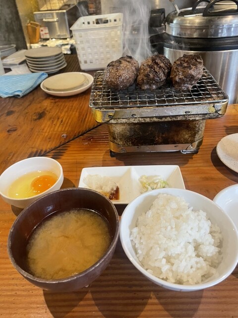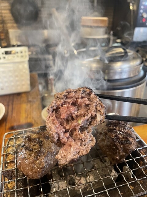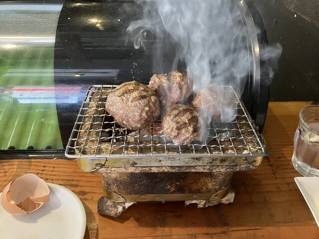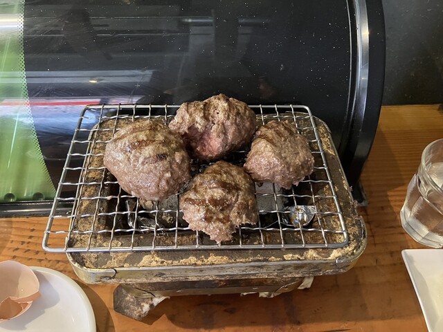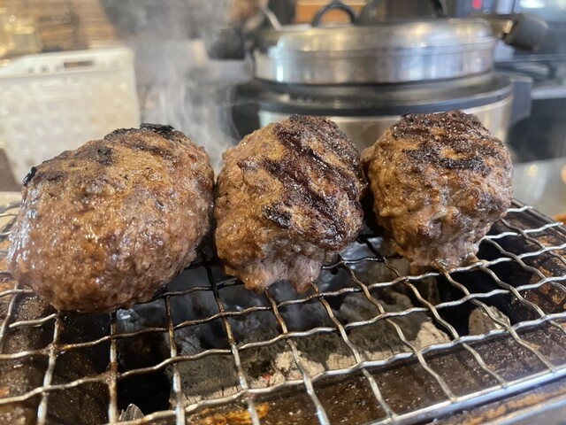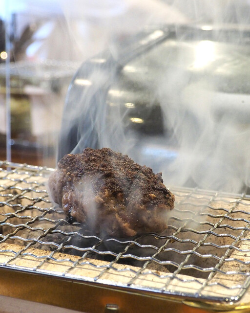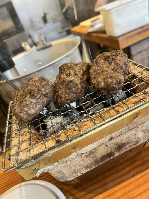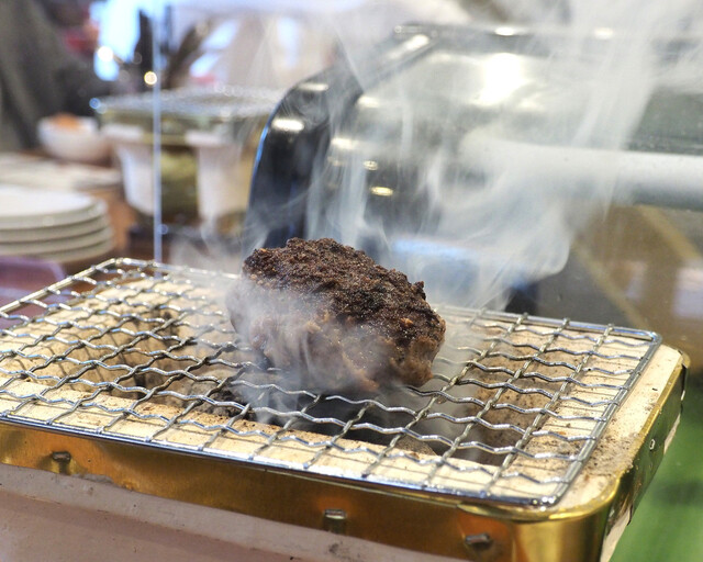 小型の卓上七輪で炭火で焼くハンバーグ。