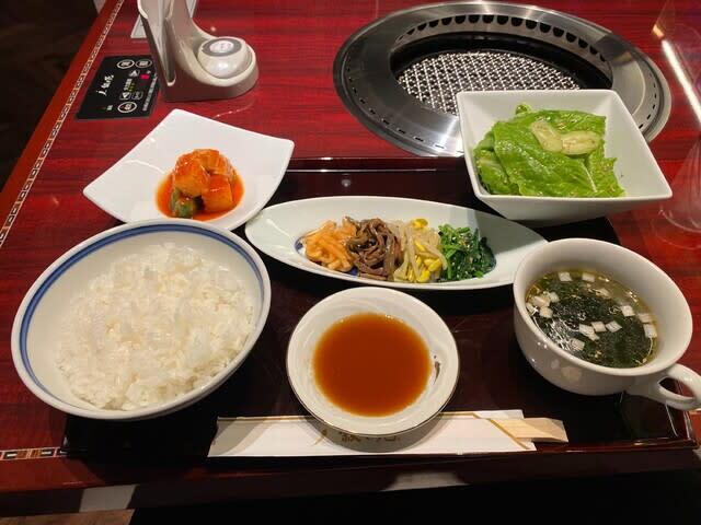 注文すると先ず料理のナムルやキムチ、スープ、サラダ、ごはんのセットが運ばれて来ました。