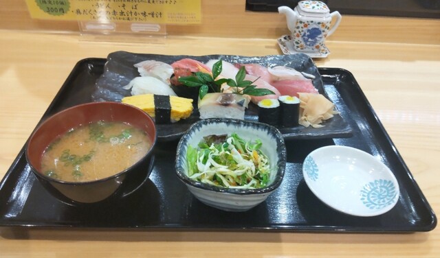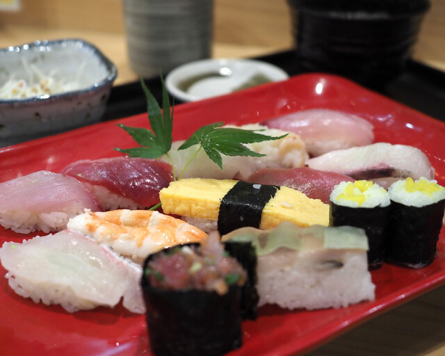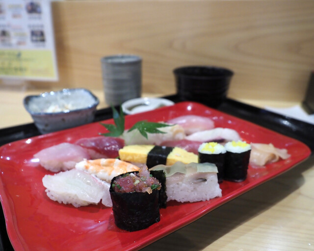 まぐろの赤身や鯛、かんぱちなどなど13貫も盛られたお寿司がリーズナブルにいただけました