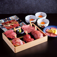 上質な焼肉を追求した「博多上肉箱コース」はあなたに贅沢なひとときをお届けします。 上質な生牛タンのタン元の薄切り、そして超新鮮な厚切りレバーに舌鼓を打ちつつ、メインの博多上肉箱の到着を待つ。 博多上肉箱では佐賀牛雌牛の上部位を5種ご用意いたしました。 上段はお肉本来の味を楽しめるようあえて下味を付けず、お肉の旨みを引き立てるお薬味のみで食し、下段は焼肉店の個性が光るタレ焼肉。千里庵の秘伝のタレと共にお召し上がりください。 また、上肉箱コースでは幻の卵「糸島桜」の卵黄でお肉の上質なまろやかさを引き出した佐賀牛の焼きすきをお楽しみください。
