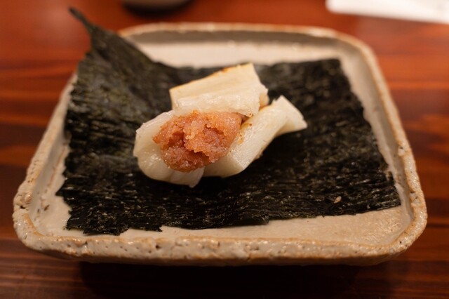明太餅は炭の香りと明太子の塩気が重なり、熱と旨味の余韻が続く。