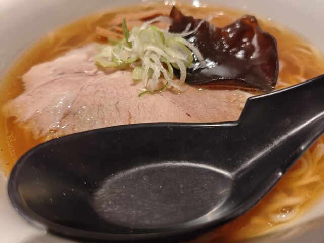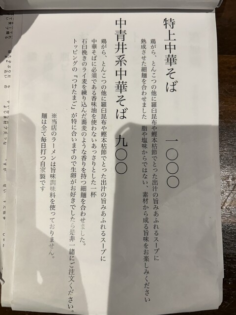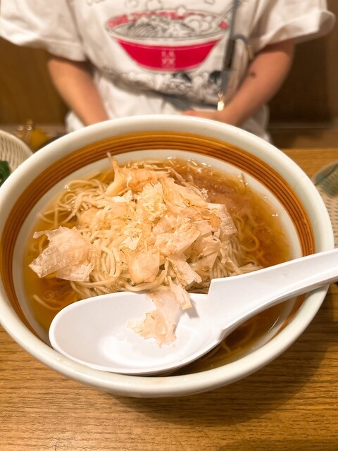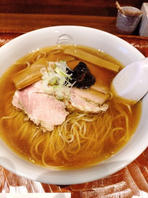 平日13:00頃訪問。待ち1人目で数分並んだけどすぐ入れる。特上中華そばが売り切れとのことで、中青井系中華そばと玉子を注文。一口つゆをすすると、ほんとに日本蕎麦みたい。麺をすすっても、ほんとに日本蕎麦...