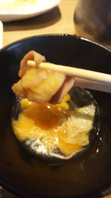 ぷりっぷりのモツを新鮮な卵にサッと潜らせて♪名物【もつすき】