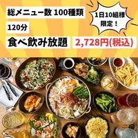 定番の居酒屋料理が食べ放題でお腹いっぱい満喫♪メインは水炊きと豚辛鍋からお選びいただけます。+300円でもつ鍋にも変更可能です!120分飲み放題も付いているので、各種ご宴会にもおすすめです。 ※金・土・日・祝前日、 年末年始期間(2024年12月16日から2025年1月13日)は+500円となります