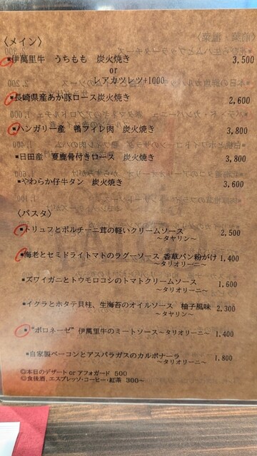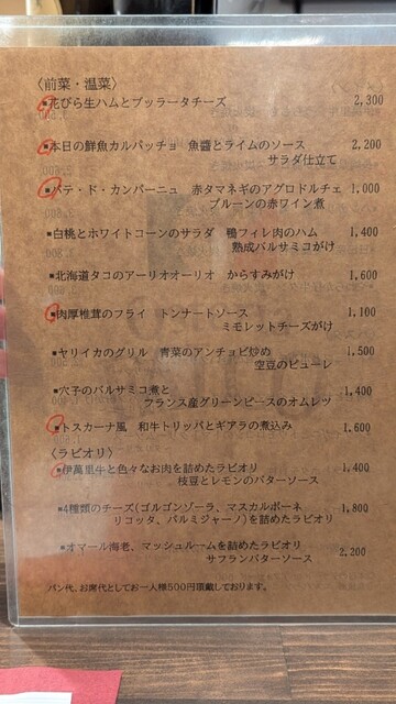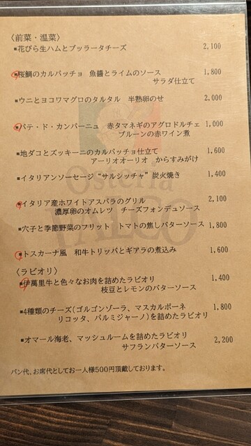 お席、季節の軽い前菜、パン代として1000円頂いております(アラカルトのみ) |