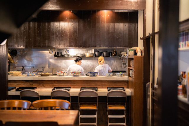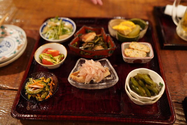 農家や産直を訪ね仕入れた旬の野菜を中心に魚や肉を取り入れたおかず料理を年代物の小皿に盛り付けたおばんざい。家庭料理だけど、家庭ではできない味付けでおもてなしします。こだわり食材を使った鍋料理がおすすめ。中国酒と共にお楽しみくださいませ。