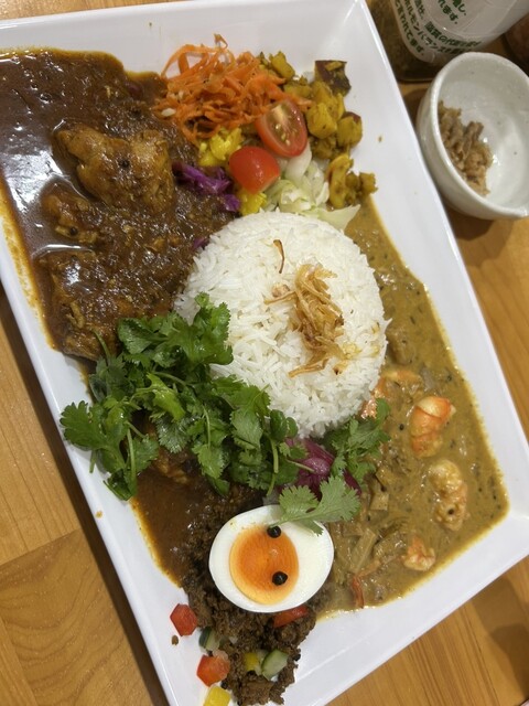 女性ふたりで切り盛りされてますが今回のオーダーはチキンとエビのあいがけカレー(小:150g)1,200円にラッサム200円を追加でお願い。