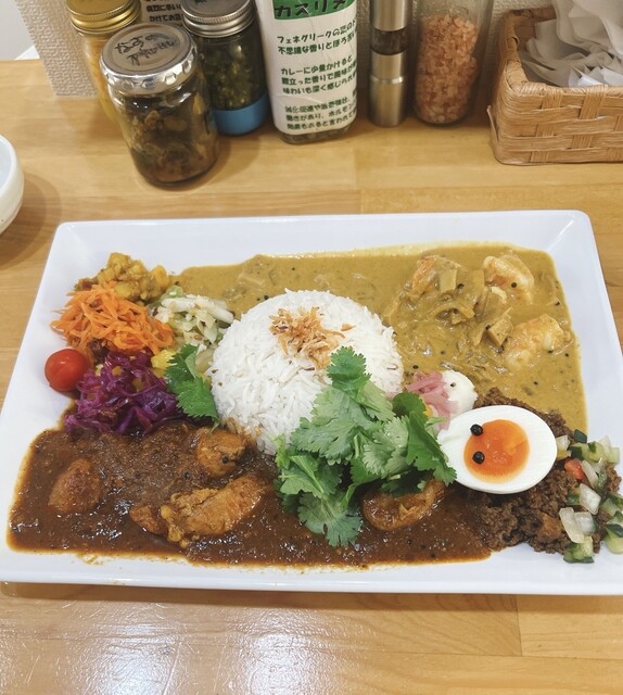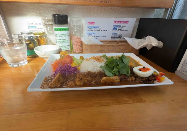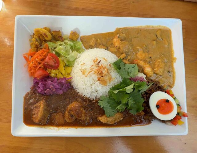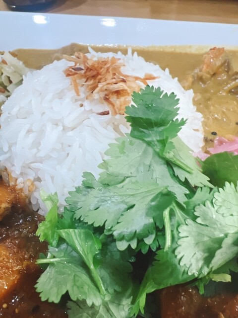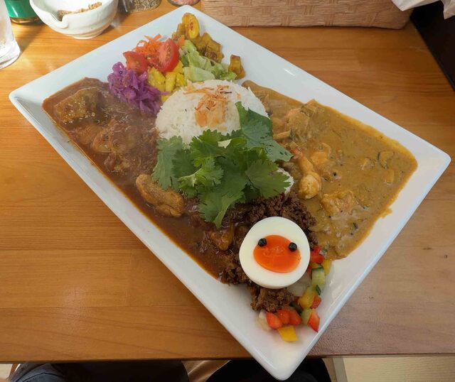 オーダーはチキンとエビカレーのあいがけを(小)サイズ1,300円でお願い♪
