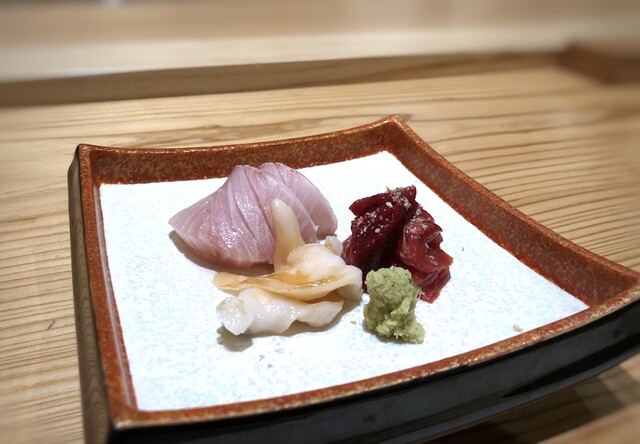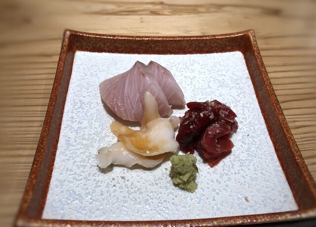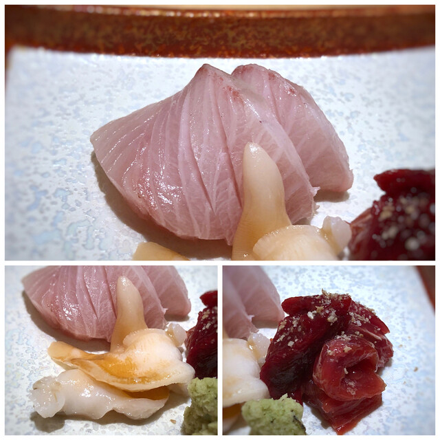 *ヨコワ鮪(中トロ)・・淡泊な中にも鮪の旨味を感じますね。 *寒鰤・・脂がのり美味しい。 *九絵・・高級魚、、美味しい。 *アコヤ貝・・コリコリ食感。