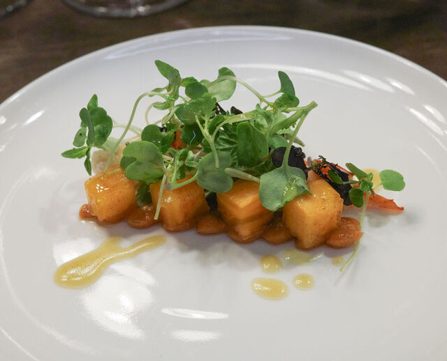 2品目は オマールエビと柿、マイクロリーフのサラダ仕立て