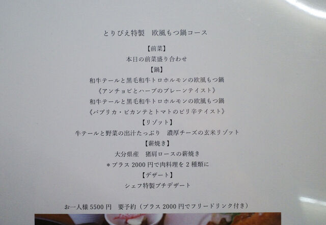 注文したのは一般的なこの店のコース。洋風もつ鍋が入ったコースで、さらに肉料理がつきます。