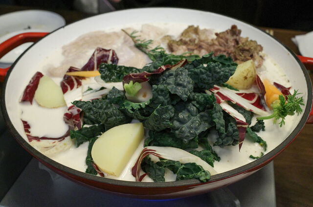 スペシャリテの洋風もつ鍋は テールの白湯(スープ)でしっかり乳化させています カーボロネロ(イタリアの黒キャベツ)の苦みがすごくよいアクセントとなっています クリーミーで濃厚だけどしつこくない