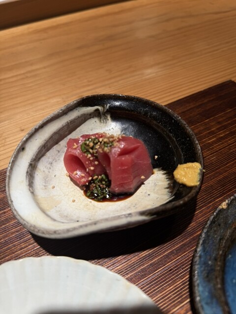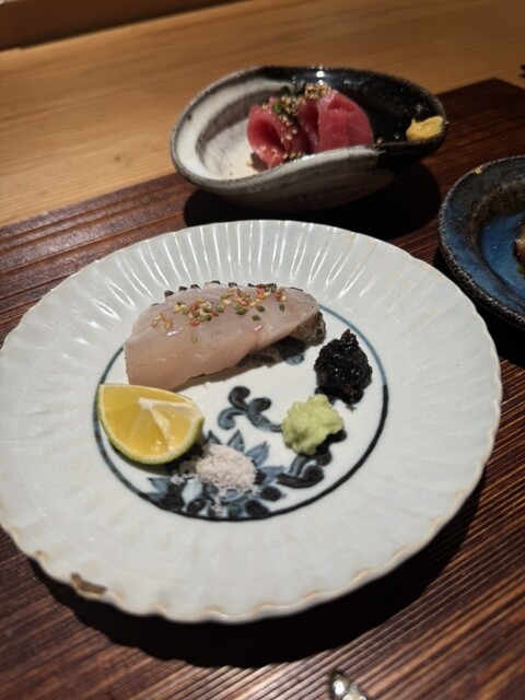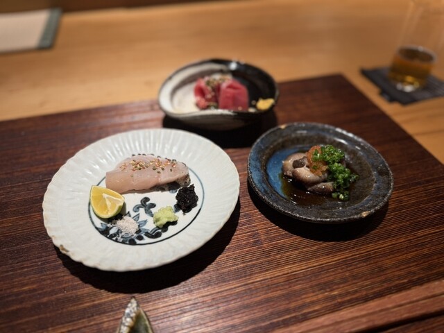 お刺身は長崎本鮪、山口赤なまこ、玄海寒鰆炙りと豪華な3種盛り。それぞれに合わせた薬味や調味料で、素材の旨みを存分に引き出しています。