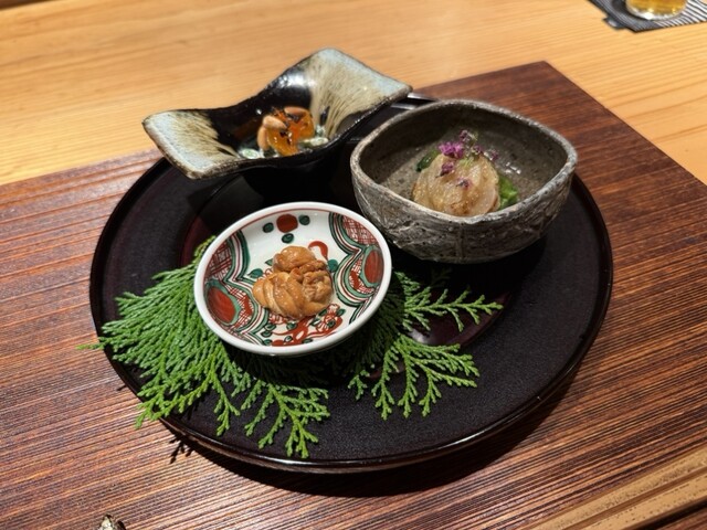 前菜のあんぽ柿とほうれん草の白和えは松の実と黒胡麻のアクセントが絶妙で、たら白子の燻製は太白オイル漬けでクリーミーな味わい。