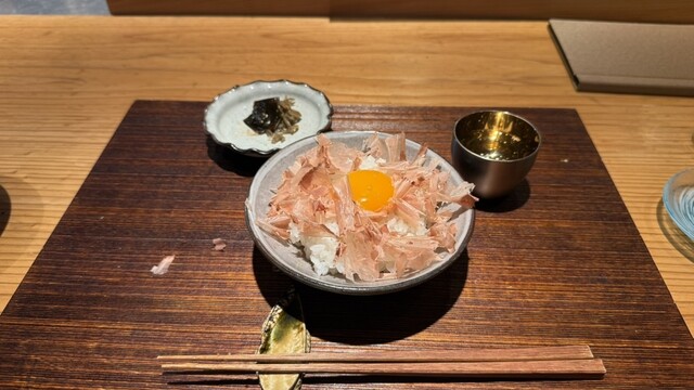ご飯は南部鉄器で炊き上げた京都米料亭厳選高級ブレンド米「翁霞」。削りたての枕崎産本枯れ節と唐津七山玉子で贅沢な卵かけご飯にしていただきました。