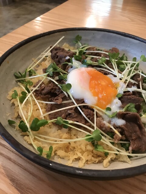 うどん日和の定番の「アボカドと海老天ぶっかけ」を冷やと鶏そぼろ丼(小)をお願いしました。