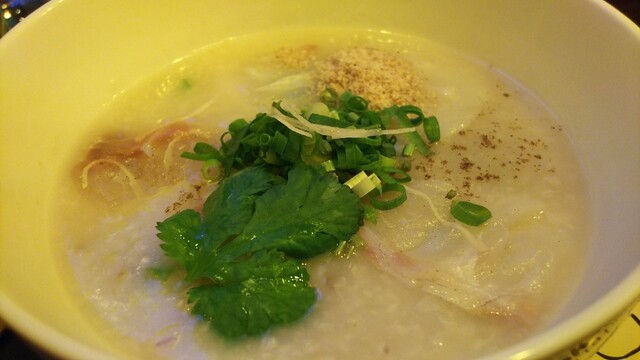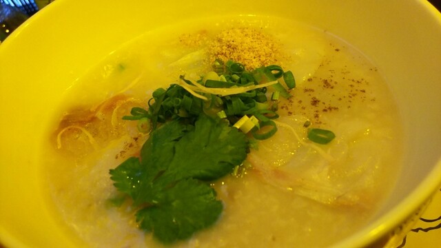 砂ずり、えび、蒸し鶏裂いたの、梅干し、パクチーひと切れの入ったお粥1298円。