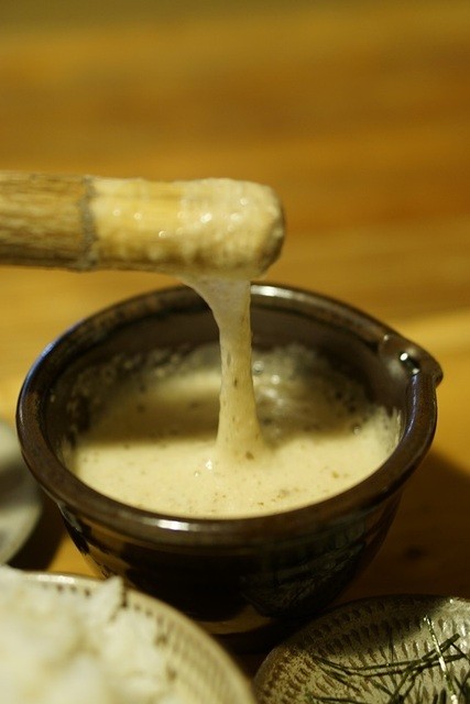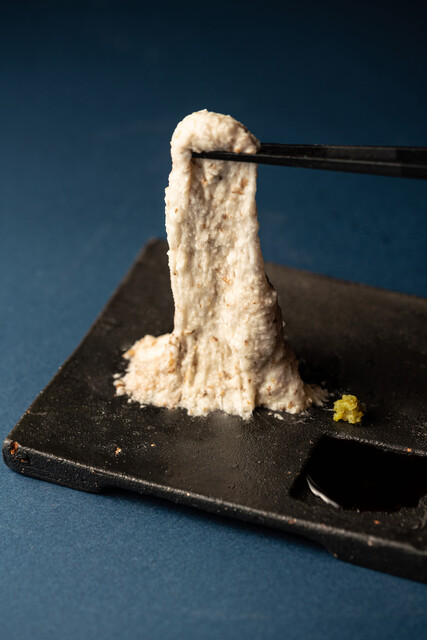 那珂川市の自社農園で栽培する『九千部朱薯』を皮ごとすりおろす生とろろは、力強い粘りで芋の味もしっかり。
