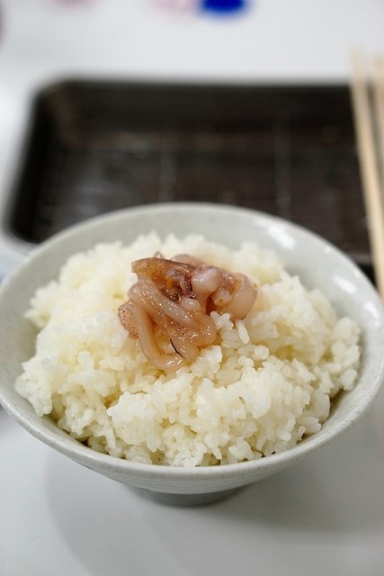 すぐに、大根おろし入りの天つゆ、白ごはん、イカの塩辛が運ばれて来ました。